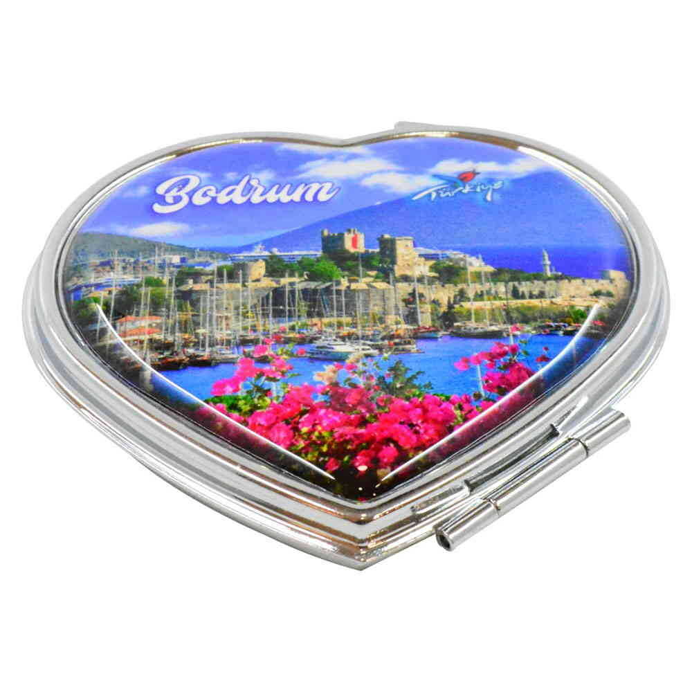 Bodrum Themed Customised Metal Epoxy Travel Make Up Compact Heart Shaped Mirror 70x65x8 mm