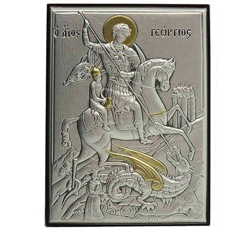 St. George With Bi-Laminated Silver Plaque, Golden Decoration And Wooden Icon 70x100 mm