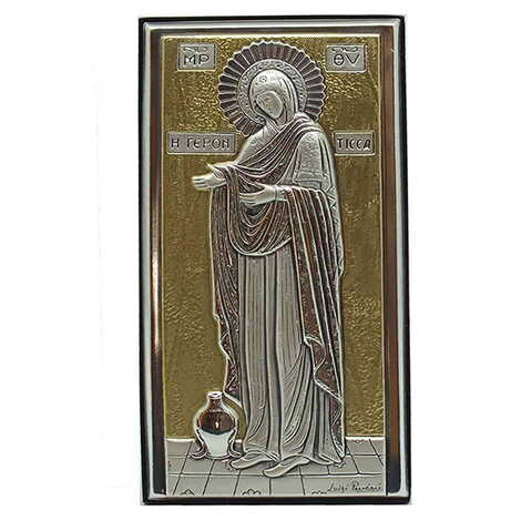 Virgin Mary Gerontissa With Bi-Laminated Silver Plaque, Golden Decoration And Wooden Icon 70x120 mm