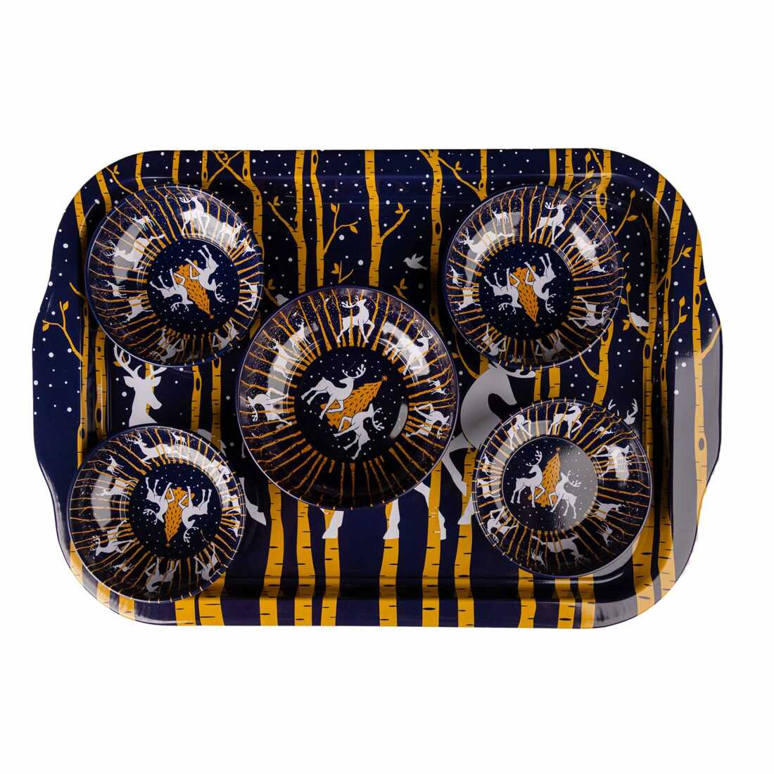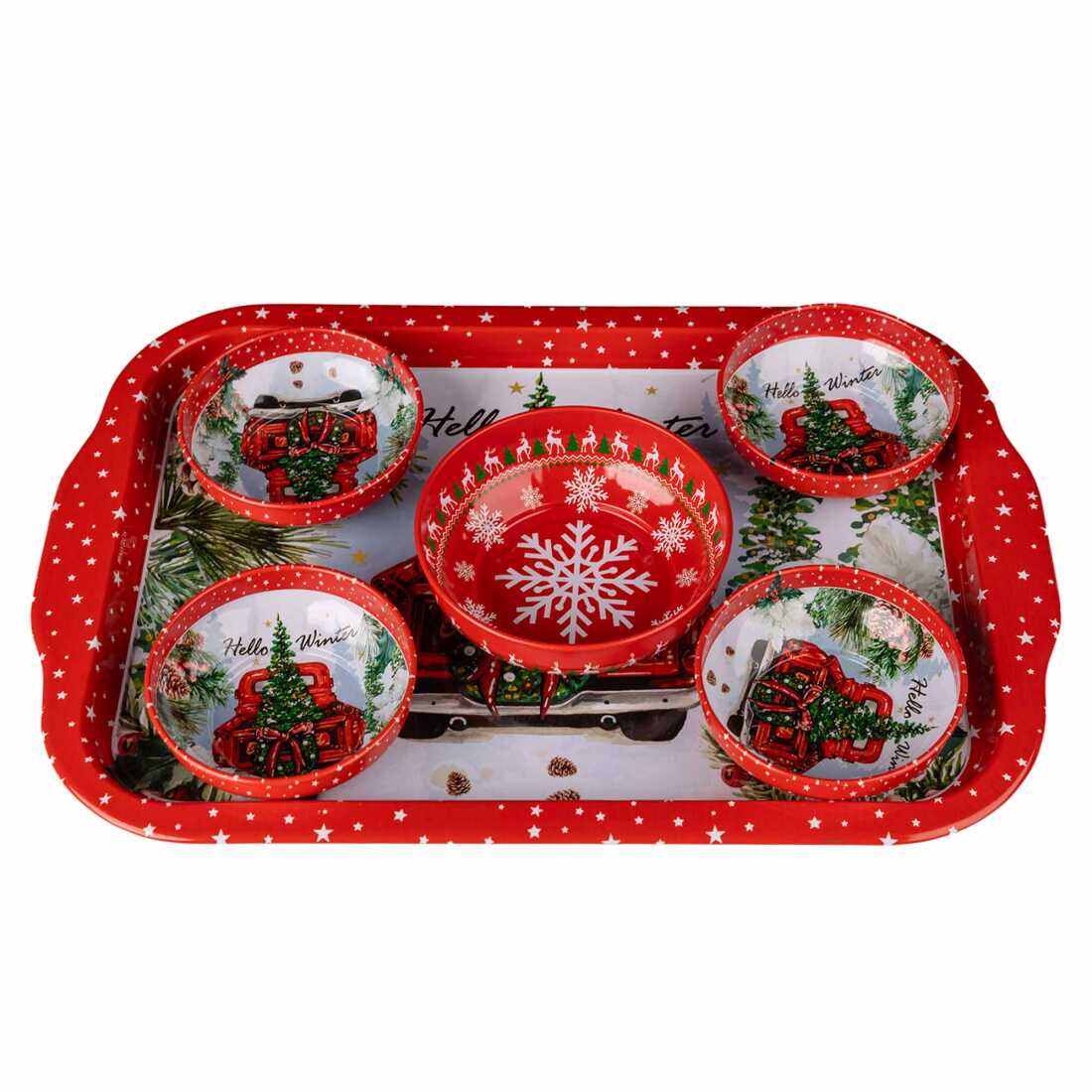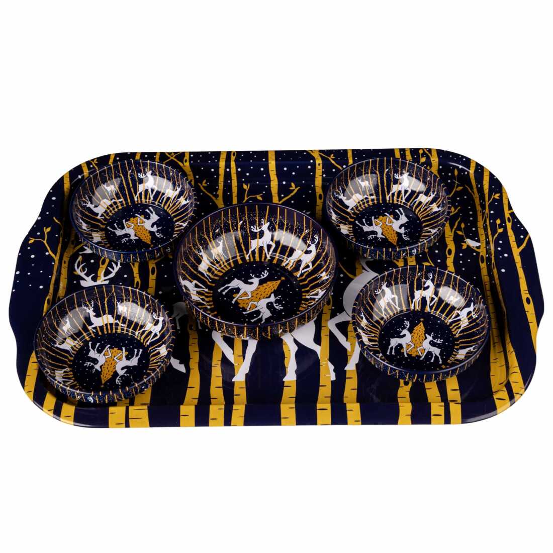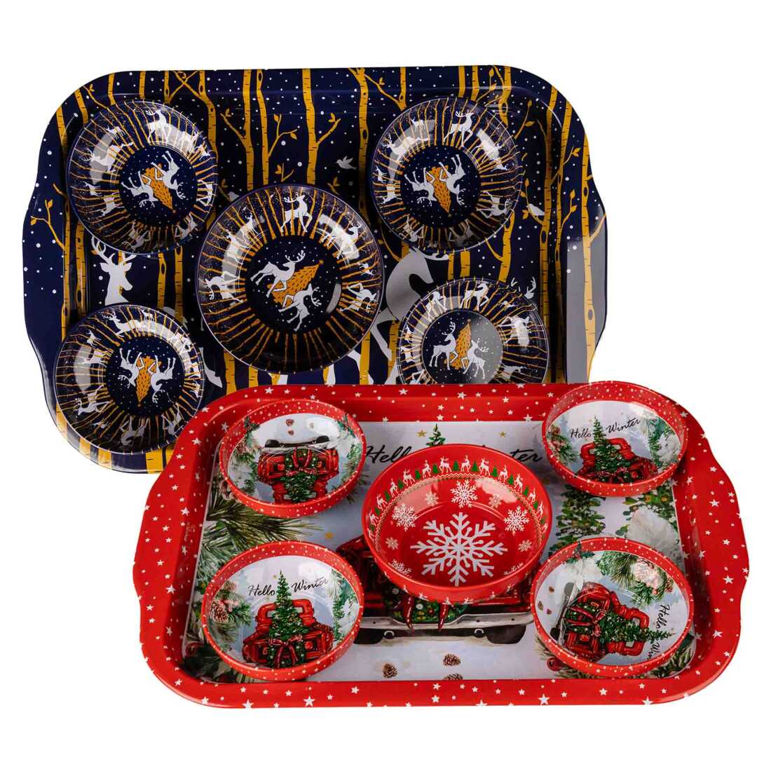 Yılbaşı Temalı Metal Büyük Dikdörtgen Tepsi Beşli Kase Seti